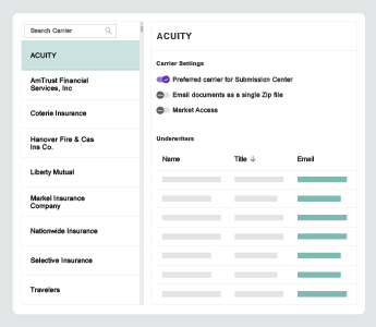 An underwriter management tool organizes carrier underwriter contacts, assigns them to specific submissions, and maintains visibility of all submissions assigned to each representative during the underwriting process.